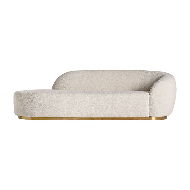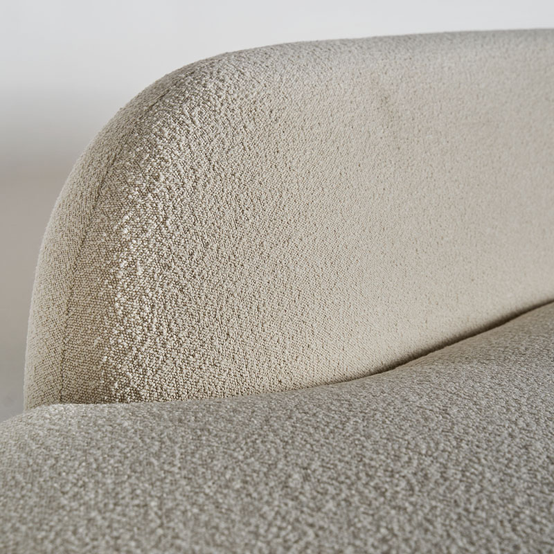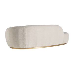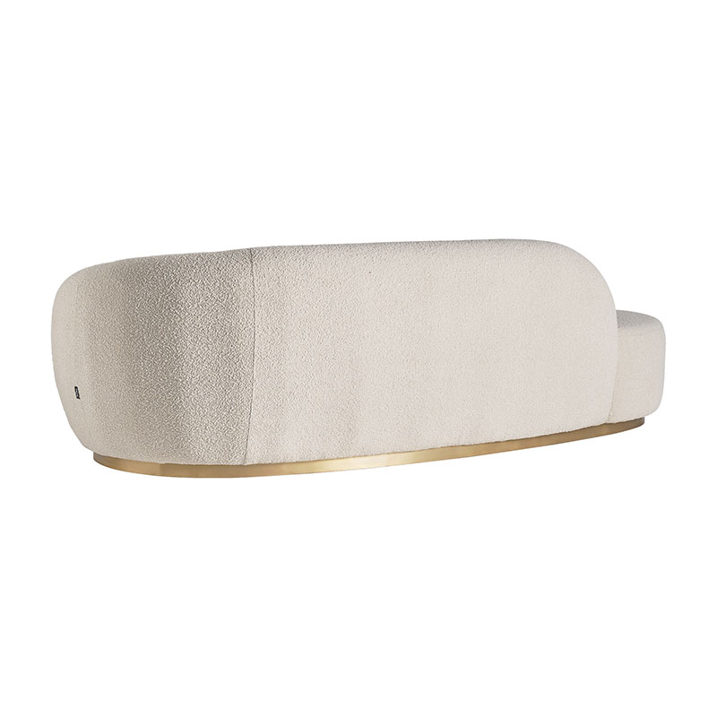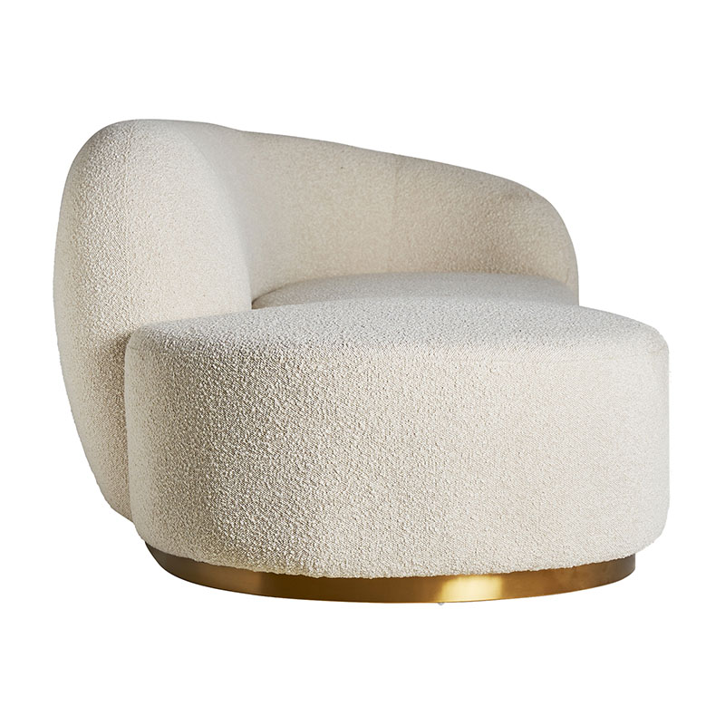 Sofá gacé de estilo art deco, fabricado en algodón bouclé en color blanco, combinado con acero y madera de pino.