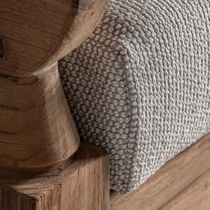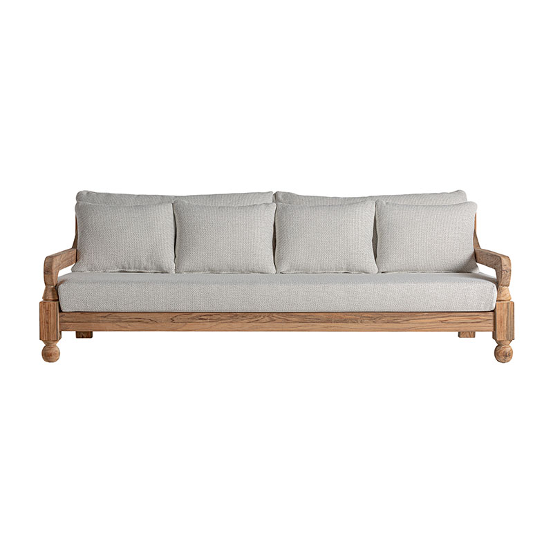 Sofá corba de estilo colonial fabricado en madera de teka reciclada en color marrón con acabado natural combinado con polipropileno reciclado y espuma. Producto desmontable desenfundable.