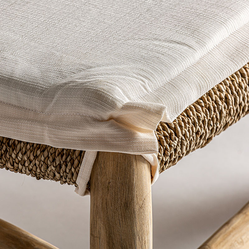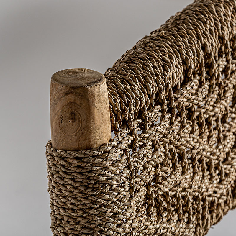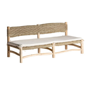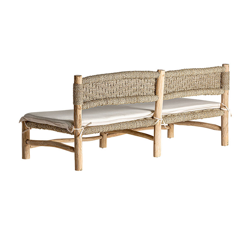 Sofá manhula de estilo colonial fabricado en madera de teka en color marrón combinado con fibra natural y poliéster.