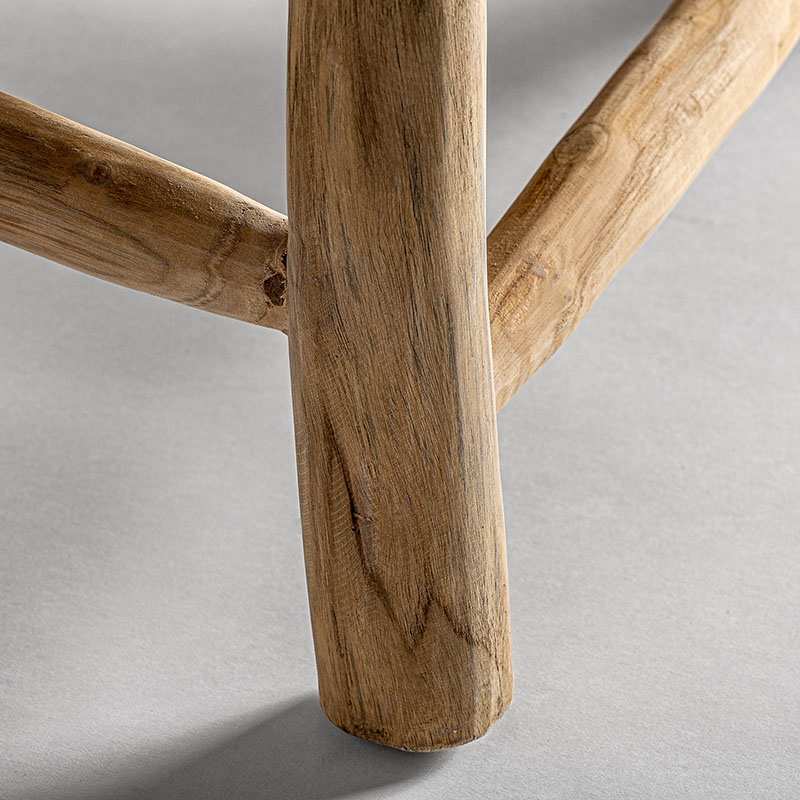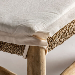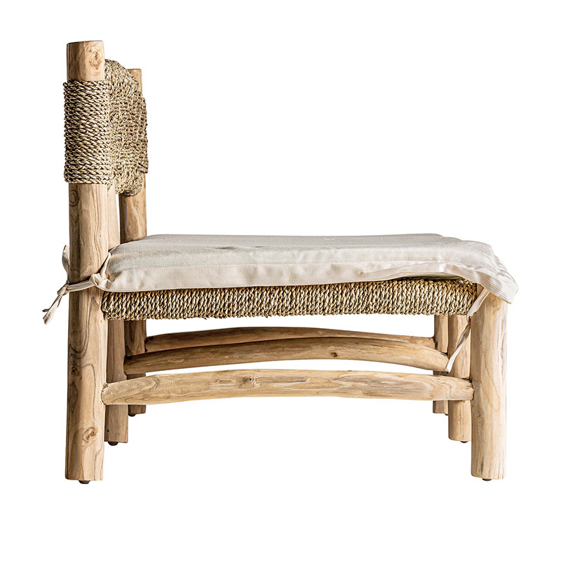 • Sofá manhula de estilo colonial fabricado en madera de teka en color marrón combinado con fibra natural y poliéster.