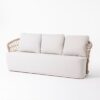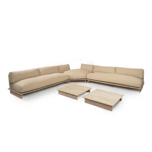 Sofá modular fabricado en madera de teca con respaldo de cuerda y cojines tapizados en color marfil. Un diseño que evoca al estilo oriental por el diseño de sus patas. Una pieza para porches o zonas chill de altura baja.