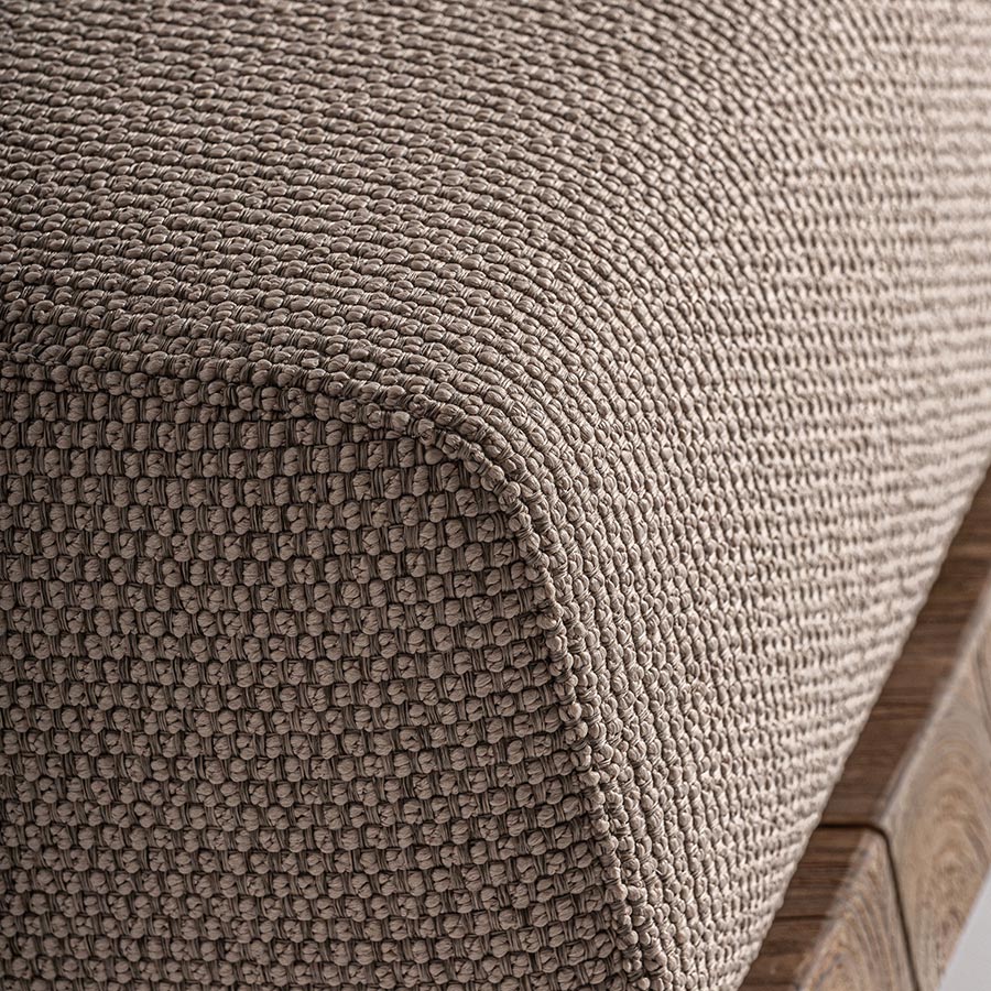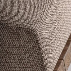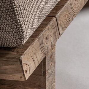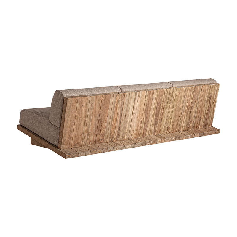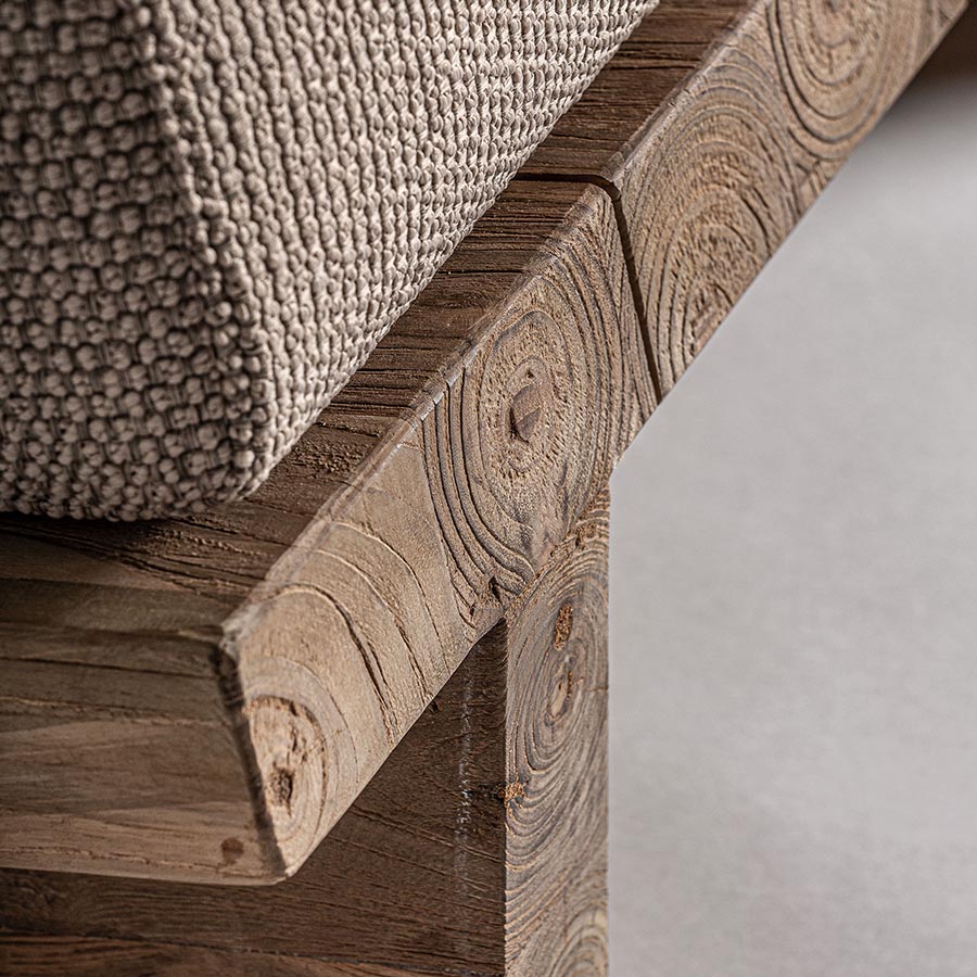 Sofá pure de estilo colonial fabricado en madera de teka reciclada en color marrón con acabado natural combinado con polipropileno reciclado en color beige y espuma. Producto desmontable desenfundable.
