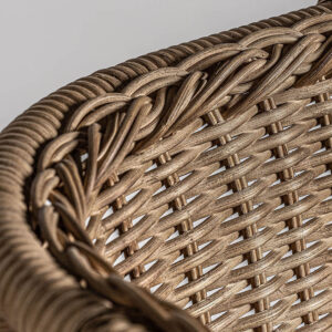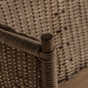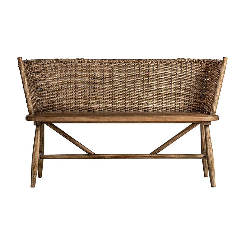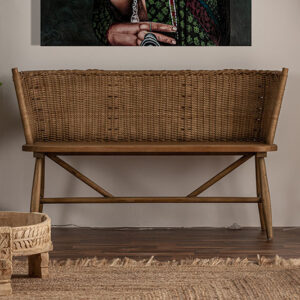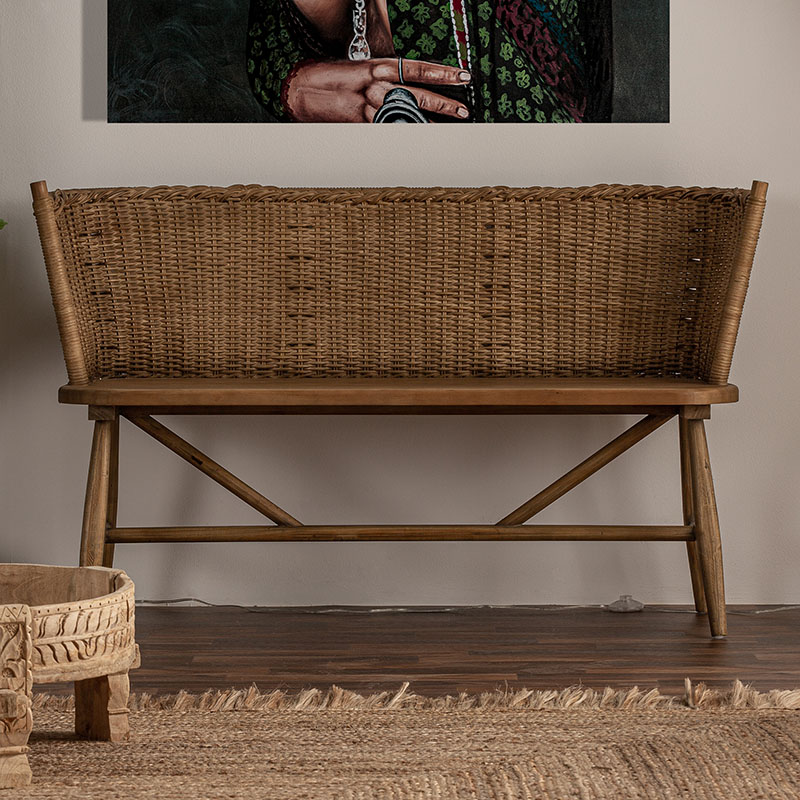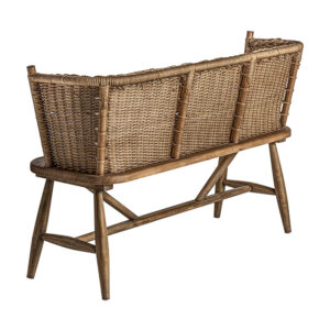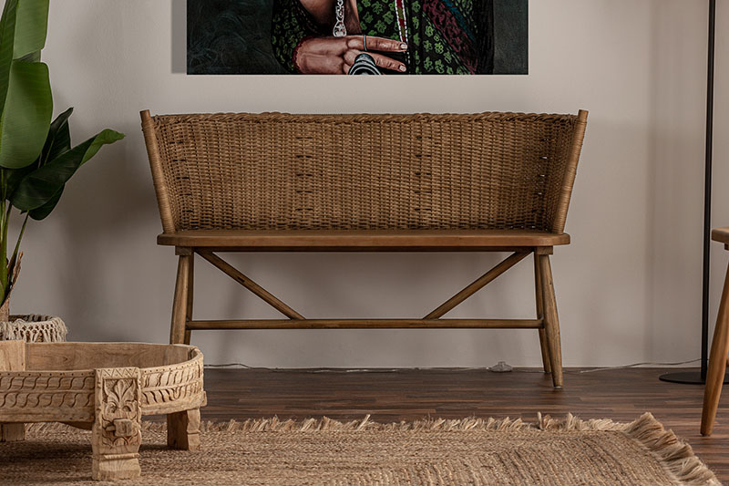 Sofá quenza, en color natural, de estilo contemporáneo. Fabricado en madera de abeto, combinado con mimbre. Producto desmontable.