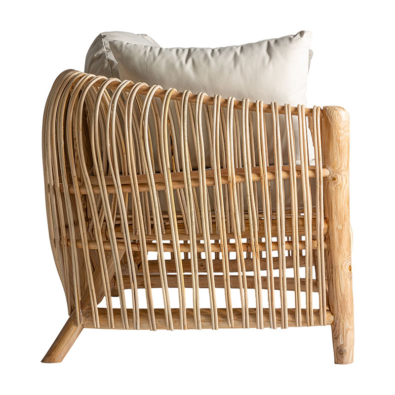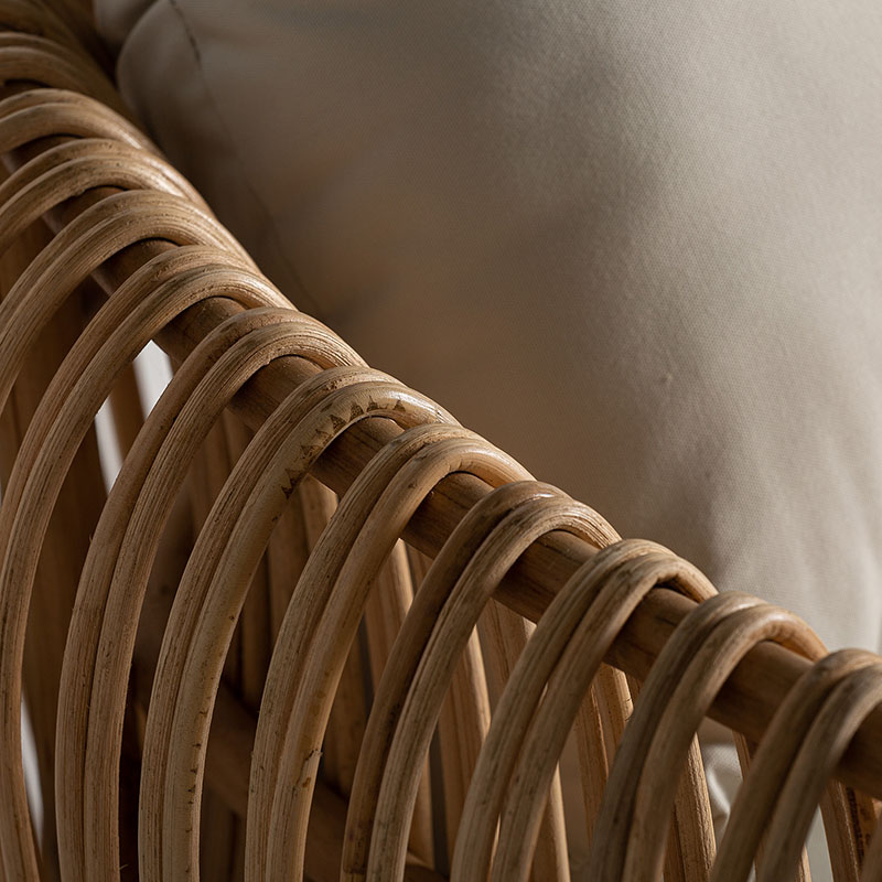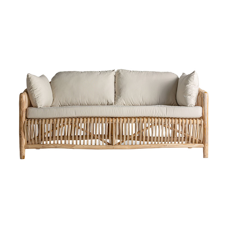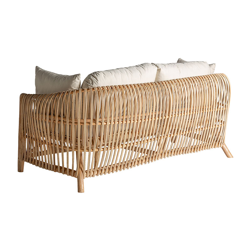 Sofá tisno, en color marrón, de estilo contemporáneo. Fabricado en ratán, combinado con algodón. Producto desmontable, desenfundable.