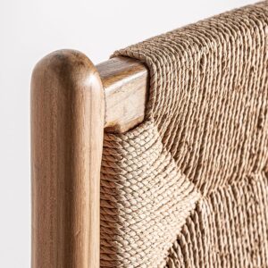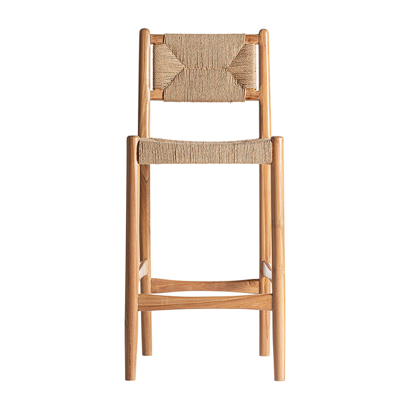 Taburete Agia de estilo contemporáneo fabricado en madera de teka en color marrón combinado con cáñamo en color marrón claro.
