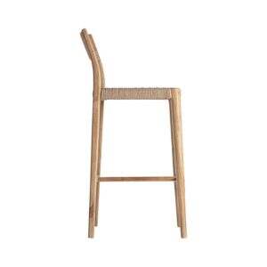 Taburete caen de estilo colonial fabricado en madera de teka en color marrón combinado con fibra natural en color marrón claro.
