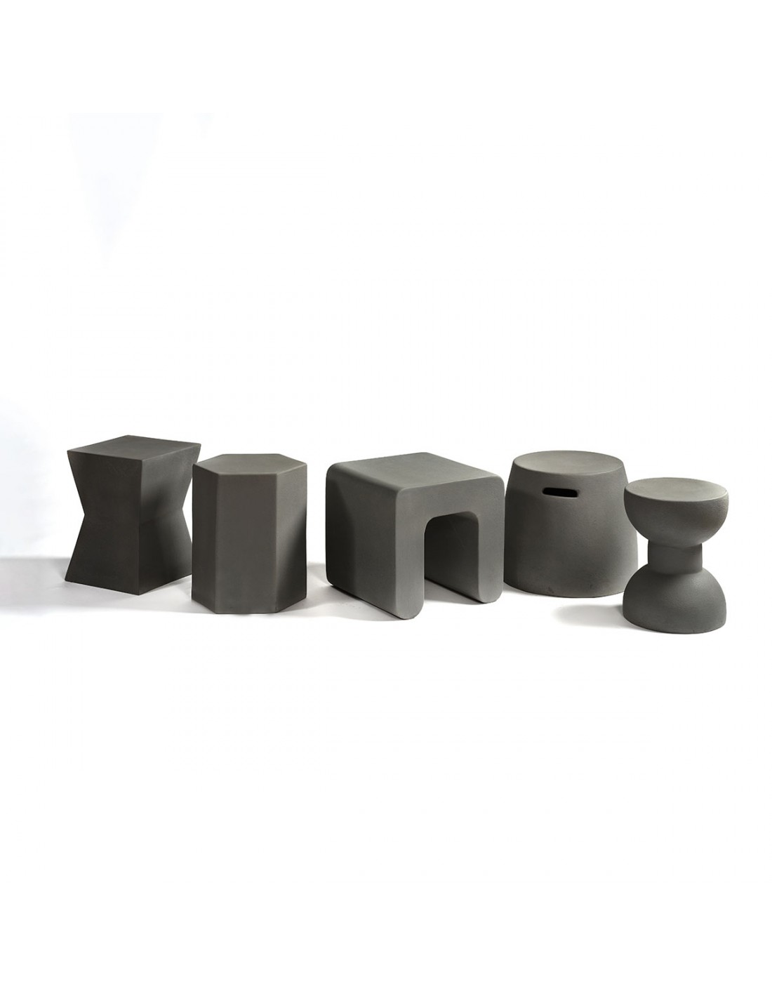 Taburete de exterior con forma hexagonal en fibra de vidrio color grisáceo.