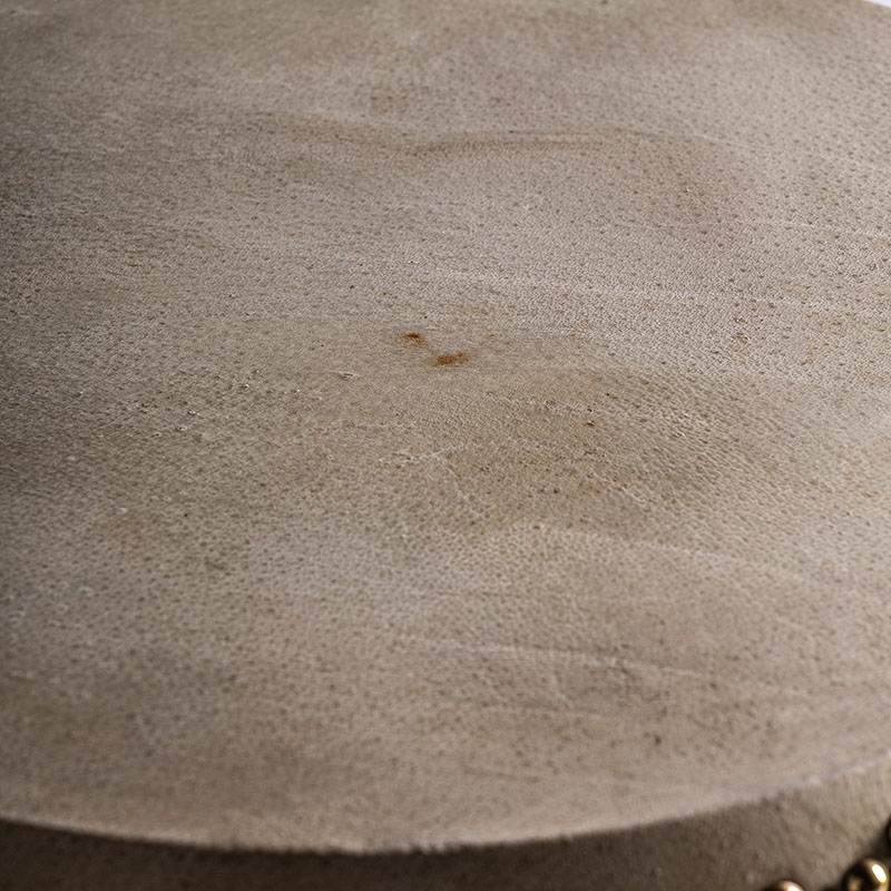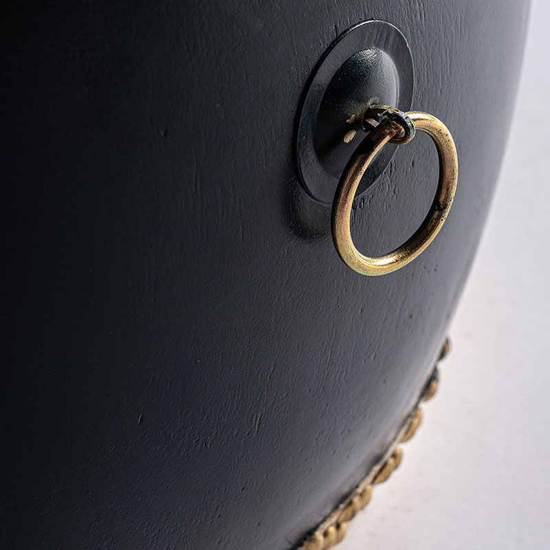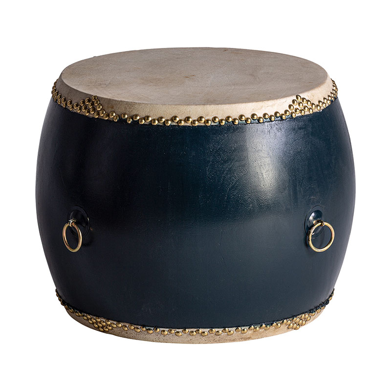 Taburete drum, en color azul marino envejecido, de estilo oriental. Fabricado en madera de olmo.