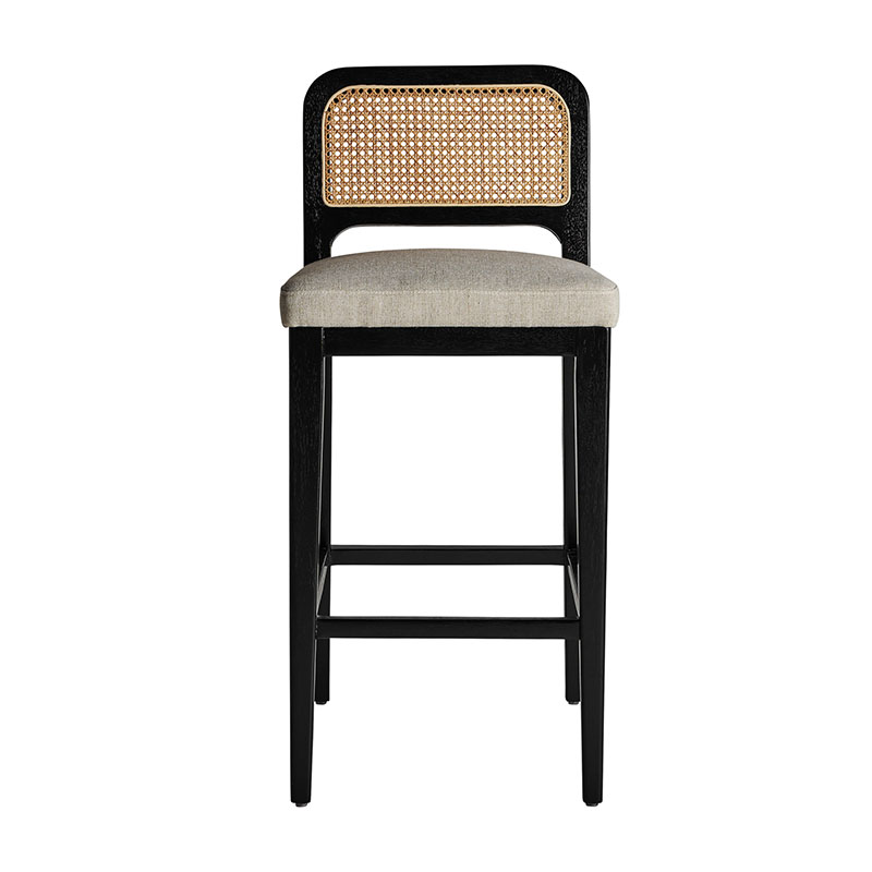 Taburete madison de estilo colonial fabricado en madera de caucho en color blanco combinado con ratán en color negro y poliéster.