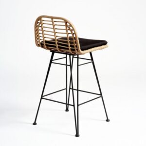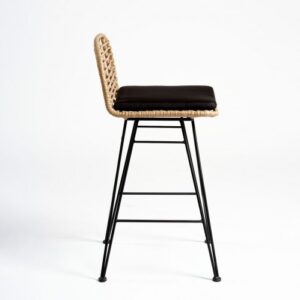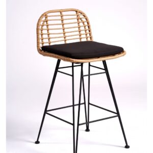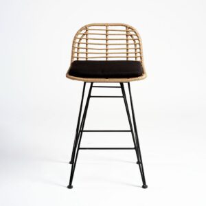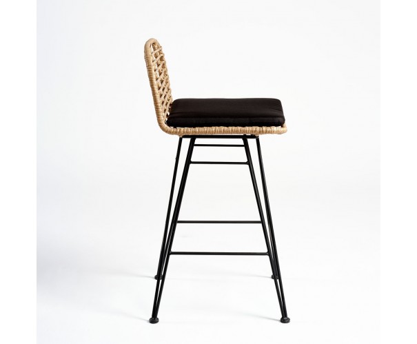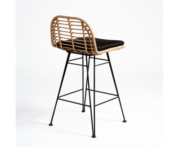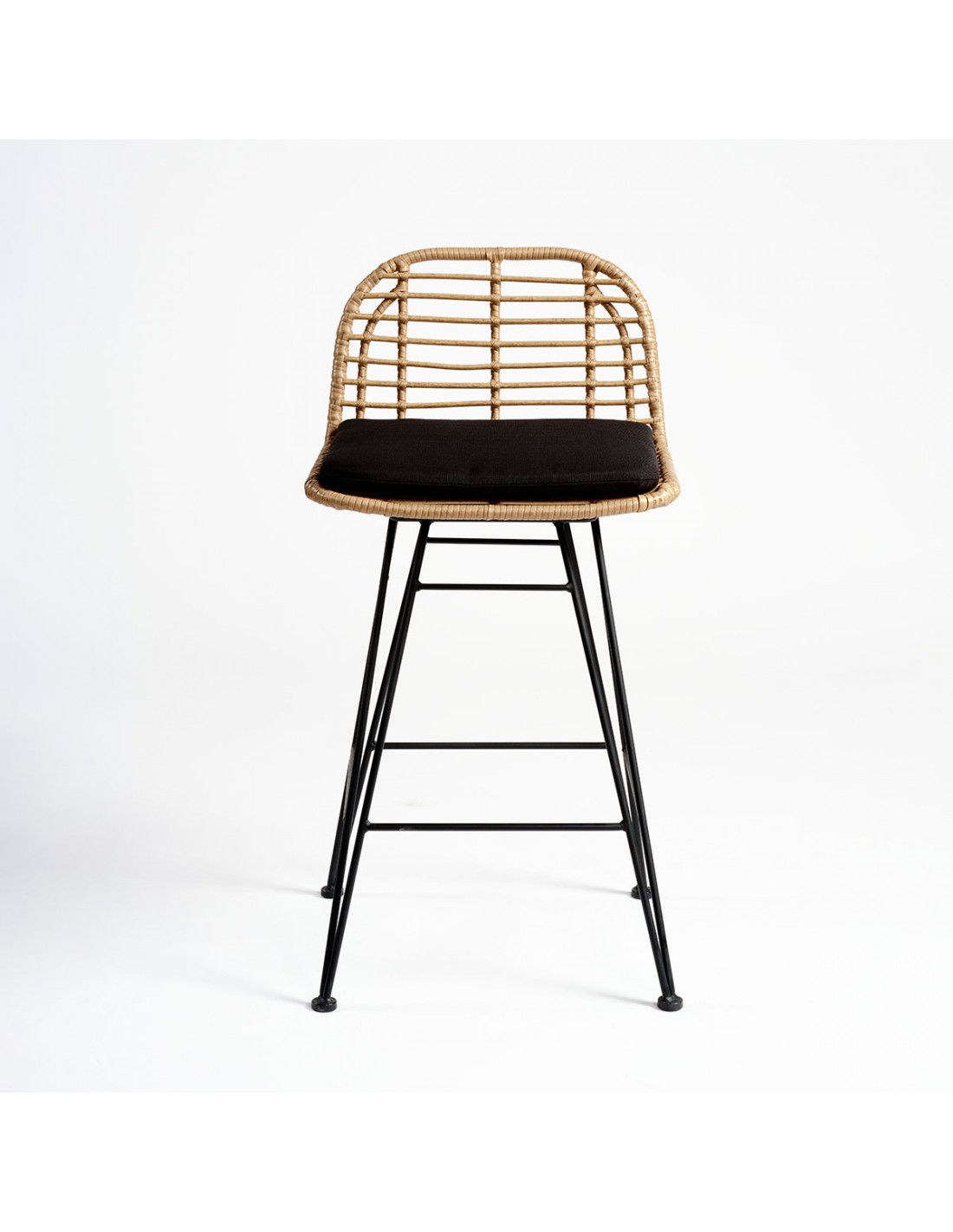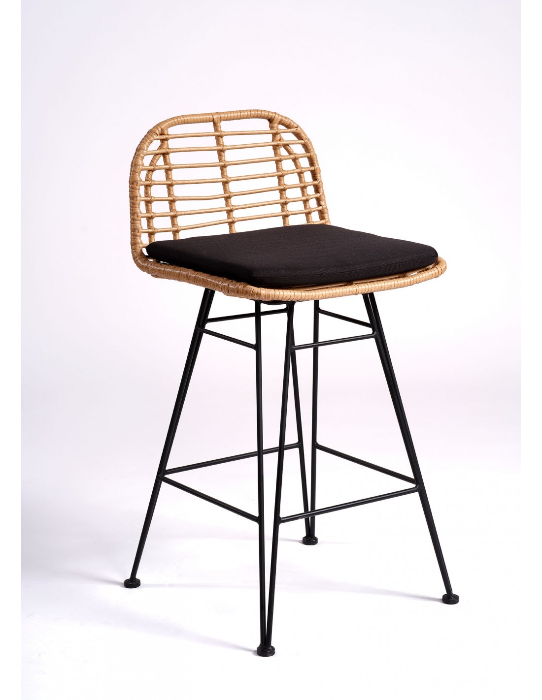 Taburete para isla de cocina de ratán sintético y metal. Un taburete de altura de cocina fabricado artesanalmente con material resistente y de fácil limpieza. Ratán sintético de color y aspecto muy natural con motas imitación al material original. Pata metálica en color negro. Cuenta además con un cojín en color negro para dar mayor comodidad a la pieza. Taburete de altura de encimera apto tanto para interior como exterior, jardín o porche.