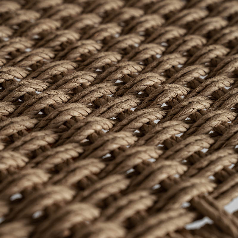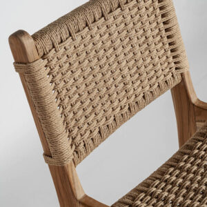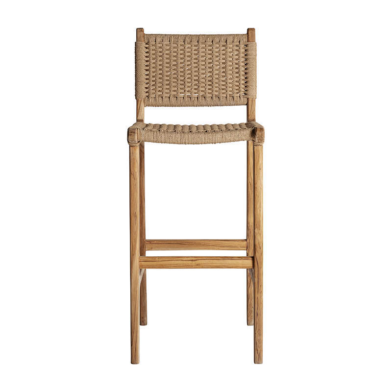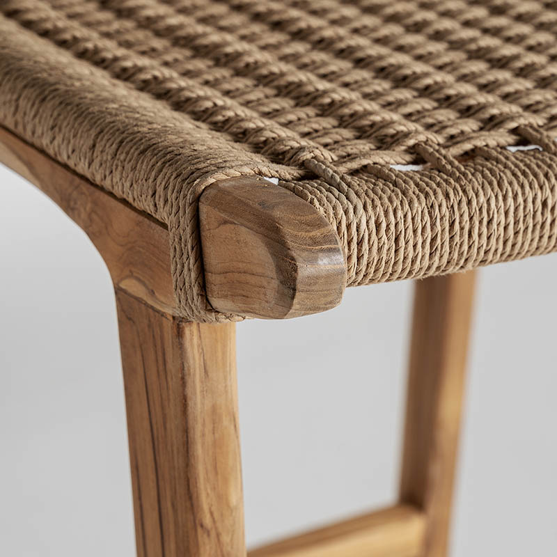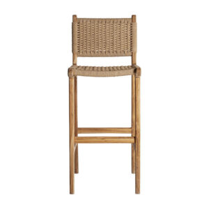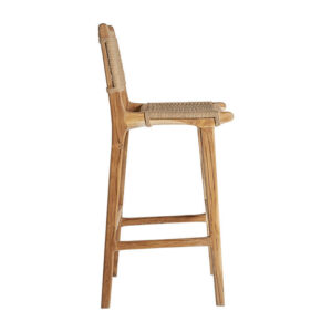 Taburete vaduz de estilo colonial fabricado en madera de teka en color marrón combinado con fibra natural.