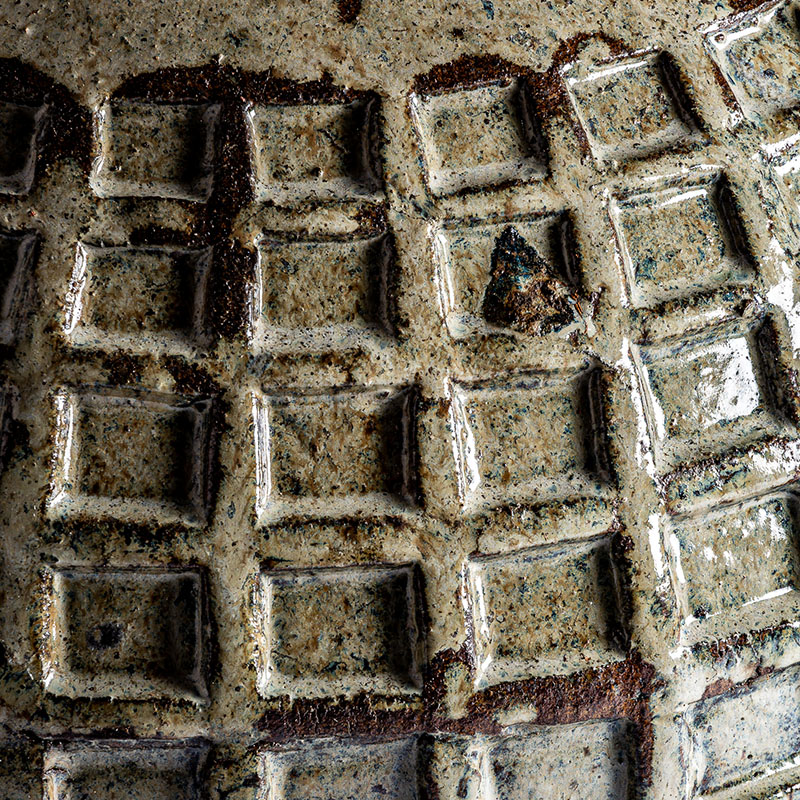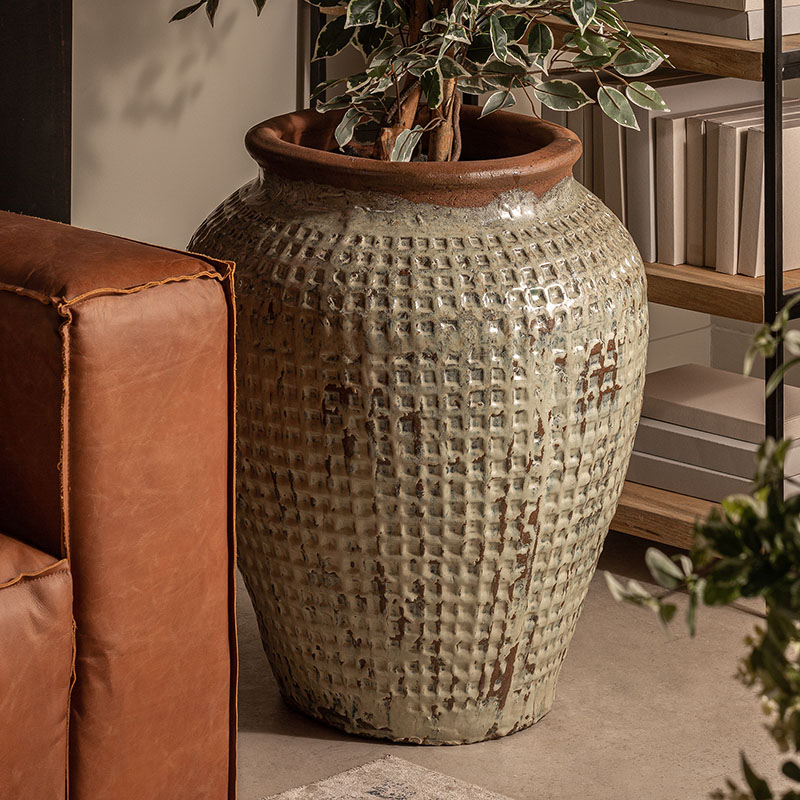 Tinaja blegy de estilo clásico fabricado en cerámica en color tonos en verde con acabado envejecido.