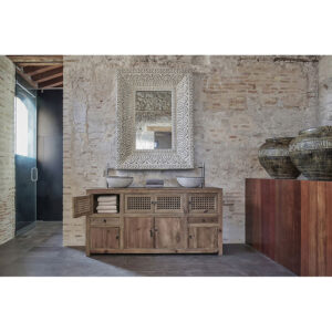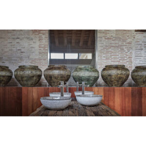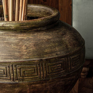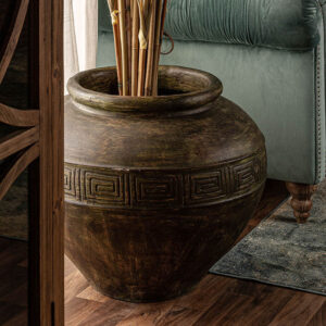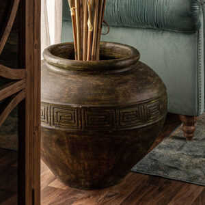 Tinaja redonda dinka, en color dorado, de estilo vintage. Fabricado en terracota.