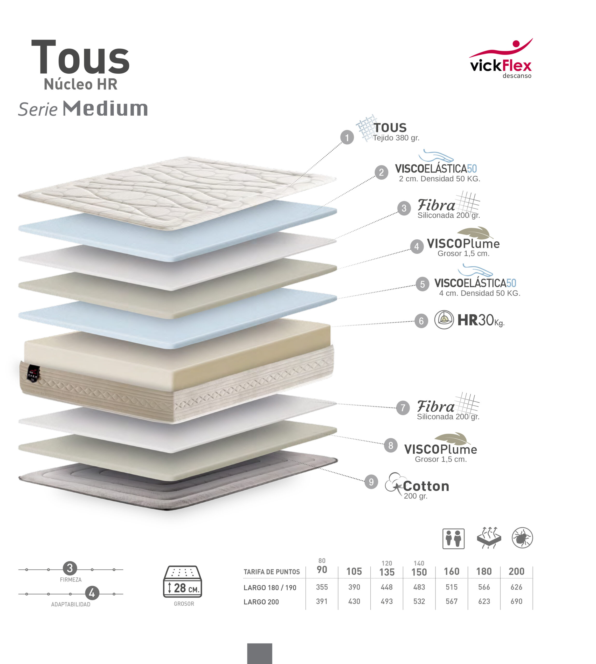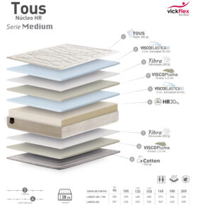 El modelo Tous es un colchón fabricado con núcleo de 30 kg, 6 cm de de Viscolástica de 50 kg en la parte superior, consiguiendo así una sensación muy suave sobre él. Su parte inferior está terminada con maya ion cotton. Punzonada para su mayor transpiración.
