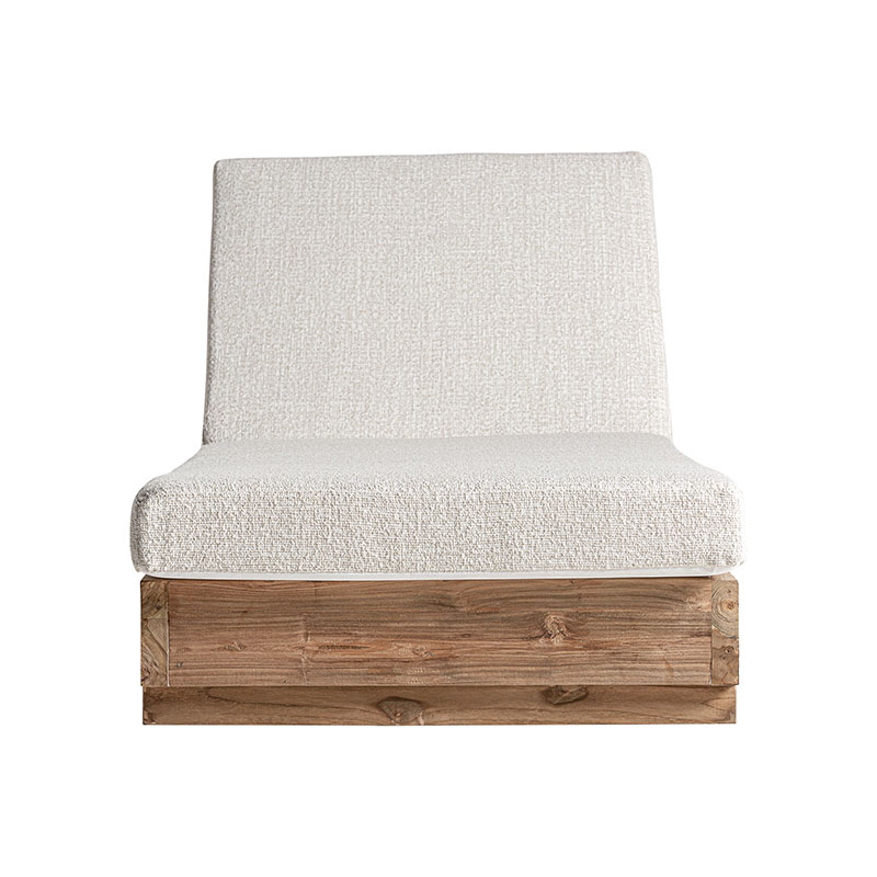 Tumbona pure de estilo colonial fabricado en madera de teka reciclada en color marrón combinado con polipropileno reciclado en color blanco. Producto desmontable plegable desenfundable.