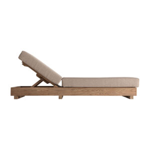 Tumbona pure de estilo colonial fabricado en madera de teka reciclada en color marrón con acabado natural combinado con polipropileno reciclado en color beige y espuma. Producto desmontable plegable desenfundable.