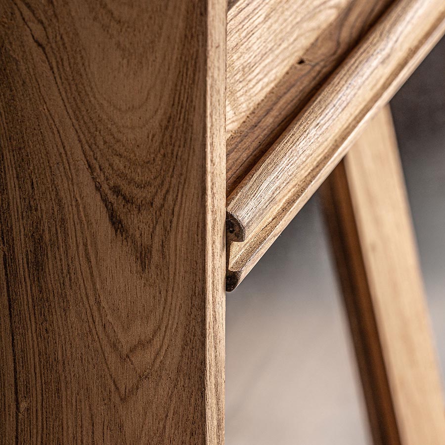 Vitrina Backlyn de estilo nórdico fabricado en madera de teka reciclada en color marrón combinado con cristal en color transparente.