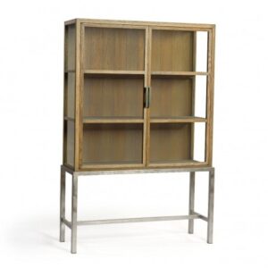 Hermosa vitrina de madera con patas de metal. Esta vitrina presenta lineas sobrias y depuradas. Vitrina sencilla, elegante y moderna, se compone de tres amplisimas baldas de madera maciza de roble y combina a la perfección con su soporte de metal envejecido.