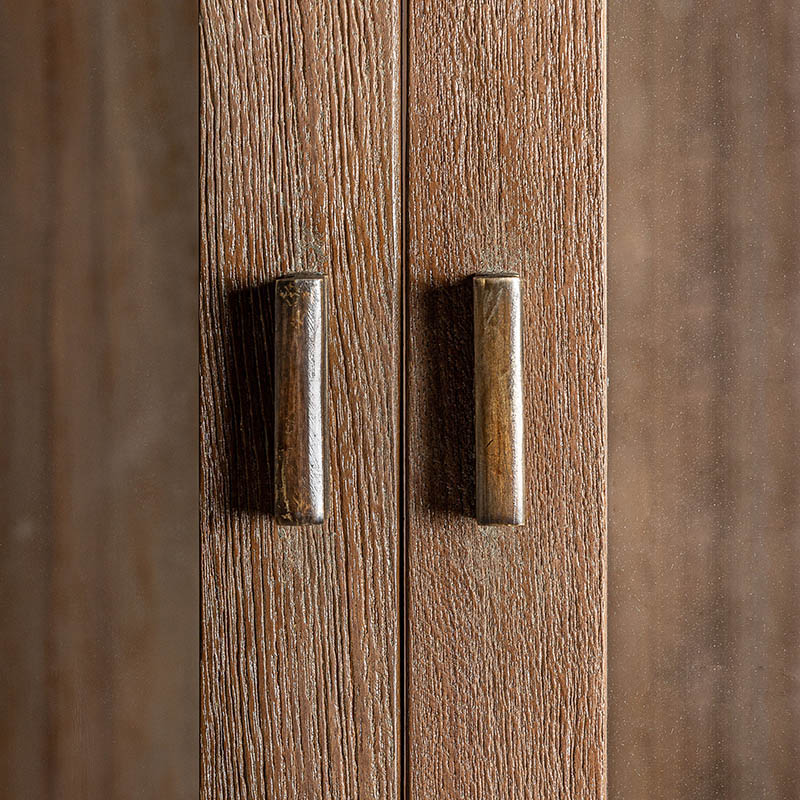 Vitrina nysted de estilo colonial fabricado en madera de teka reciclada en color marrón combinado con cristal. Producto apilable.