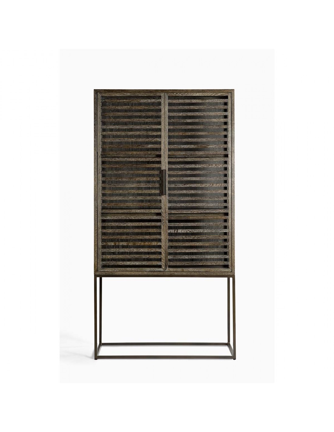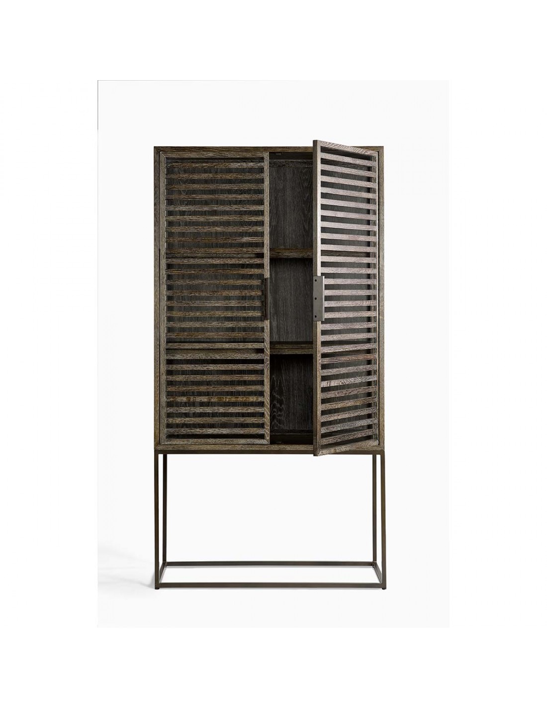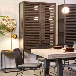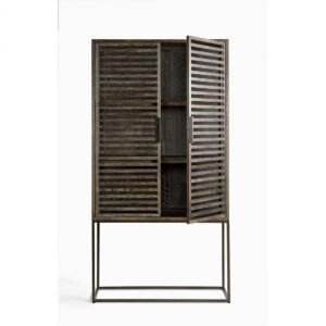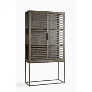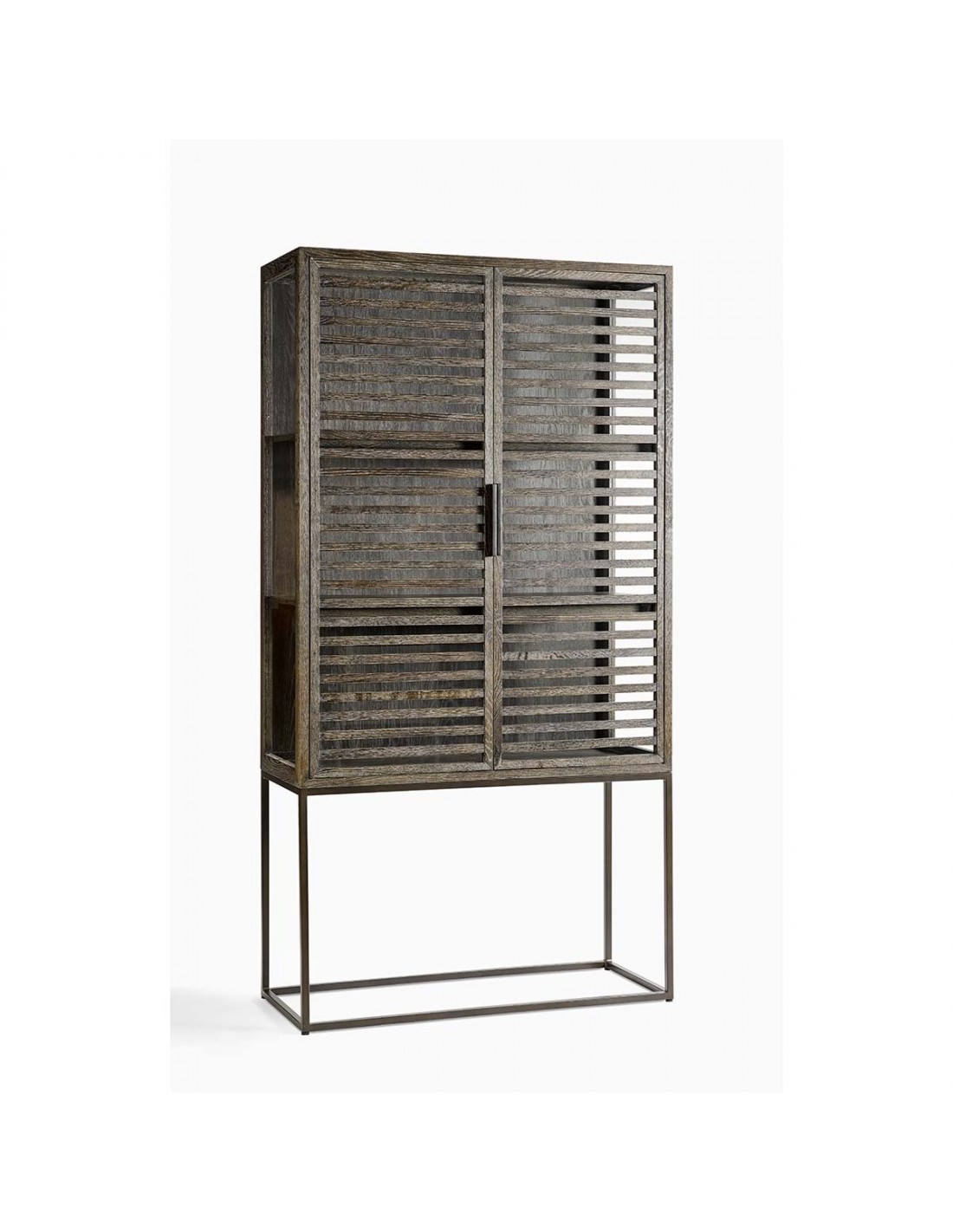 Vitrina de roble grisáceo, con estructura y tiradores en metal. Cuenta con doble puerta acristalada y dos baldas en el interior. Es una pieza de estilo depurado, con gran capacidad de almacenamiento. Perfecta para incorporarla en espacios de estilo rústico o industrial.