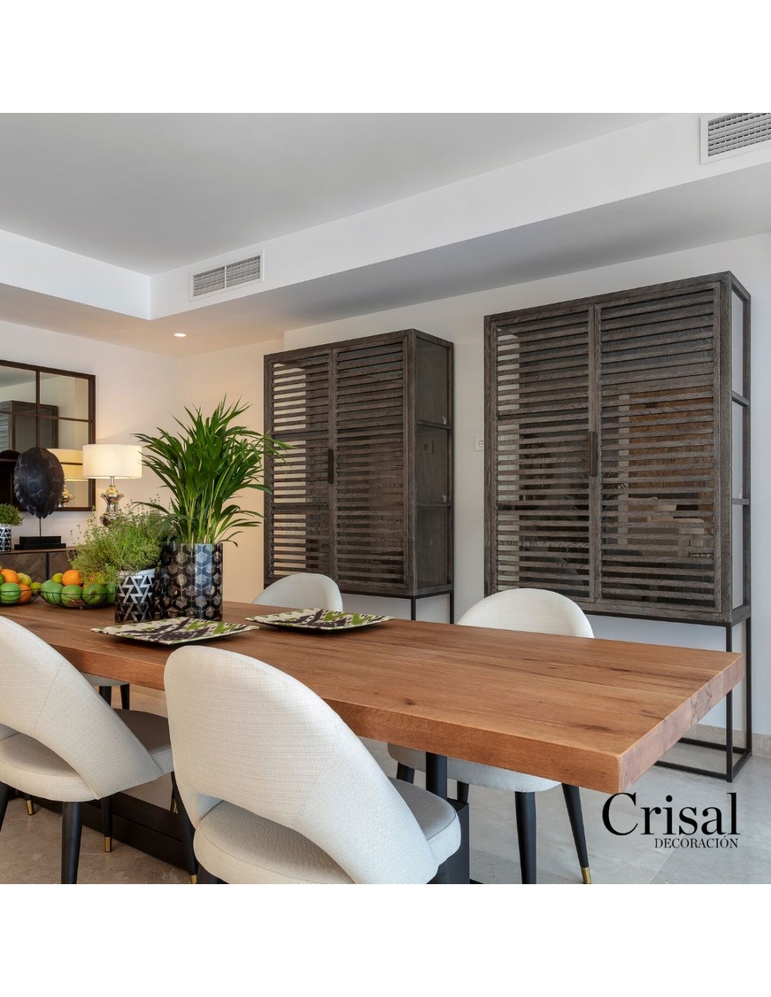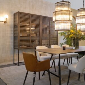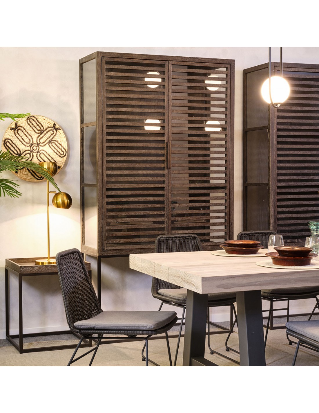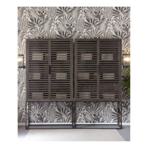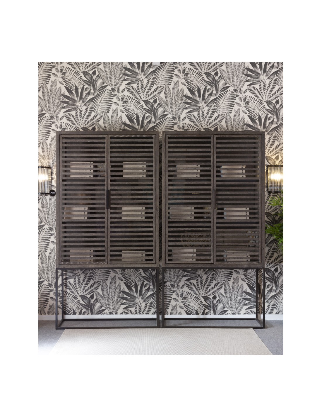Vitrina de roble grisáceo, con estructura y tiradores en metal. Cuenta con doble puerta acristalada y dos baldas en el interior. Es una pieza de estilo depurado, con gran capacidad de almacenamiento. Perfecta para incorporarla en espacios de estilo rústico o industrial.