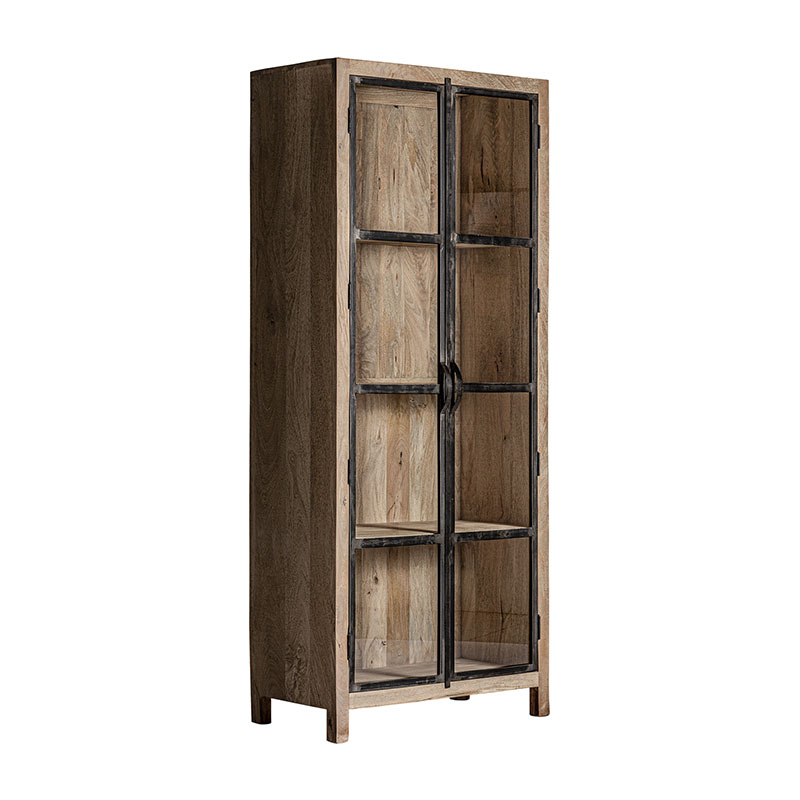 Vitrina weyer de estilo colonial fabricado en madera de mango en color marrón combinado con hierro y vidrio.