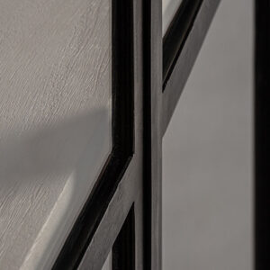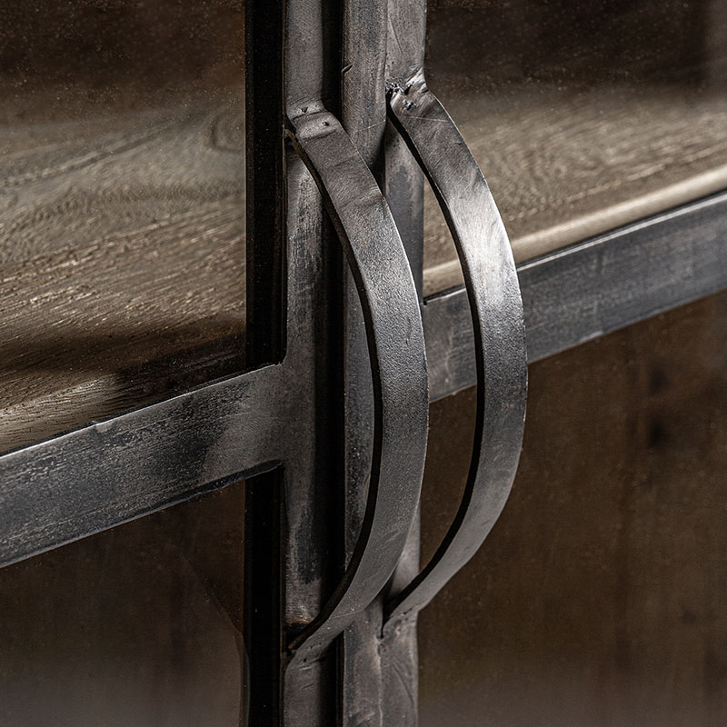 Vitrina lavik de estilo industrial fabricado en madera de pino reciclado en color negro con acabado envejecido combinado con hierro en color natural y cristal. Producto desmontable.
